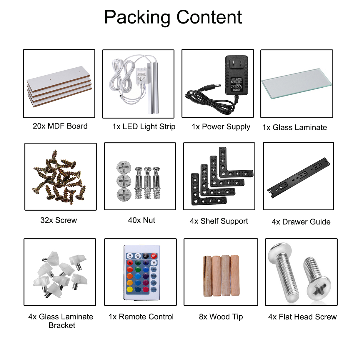 ( 20x MDF Board+32x Screw+40x Nut+4x Drawer Guide+4x Glass Laminate Bracket+4x Shelf Support+1x Glass Laminate+8x Wood Tip+4x Flat Head Screw)