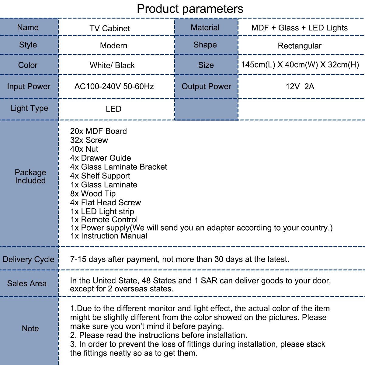 7.The TV cabinet comes complete with Multi-colour RGB LED backlight (remote control for colour changing included).