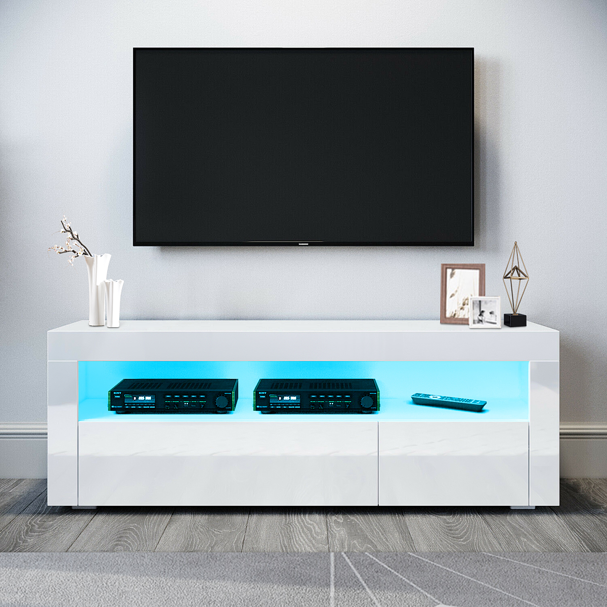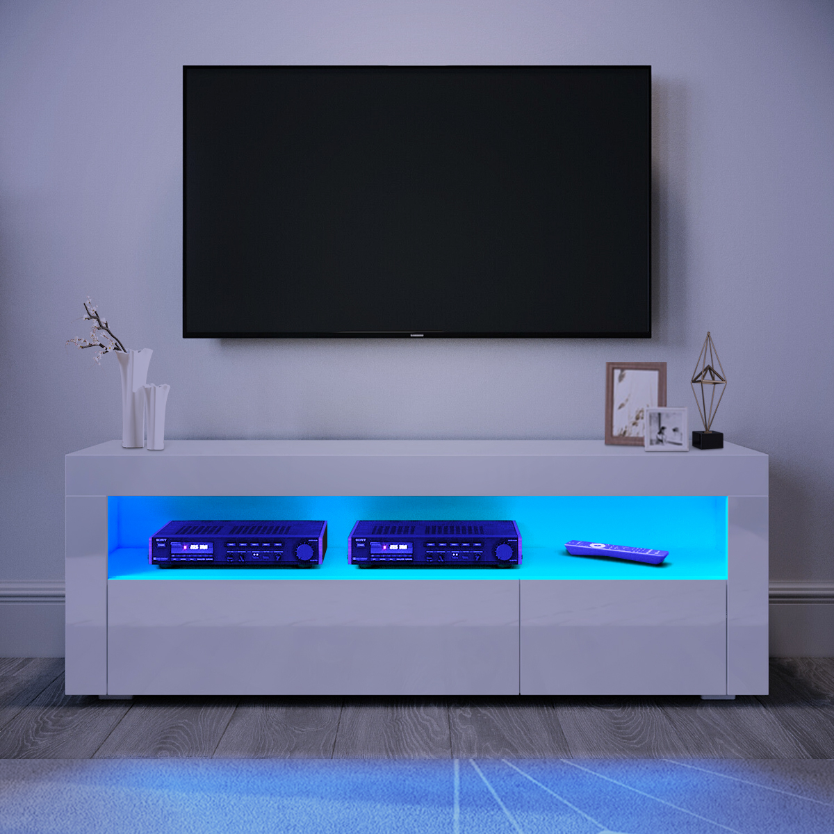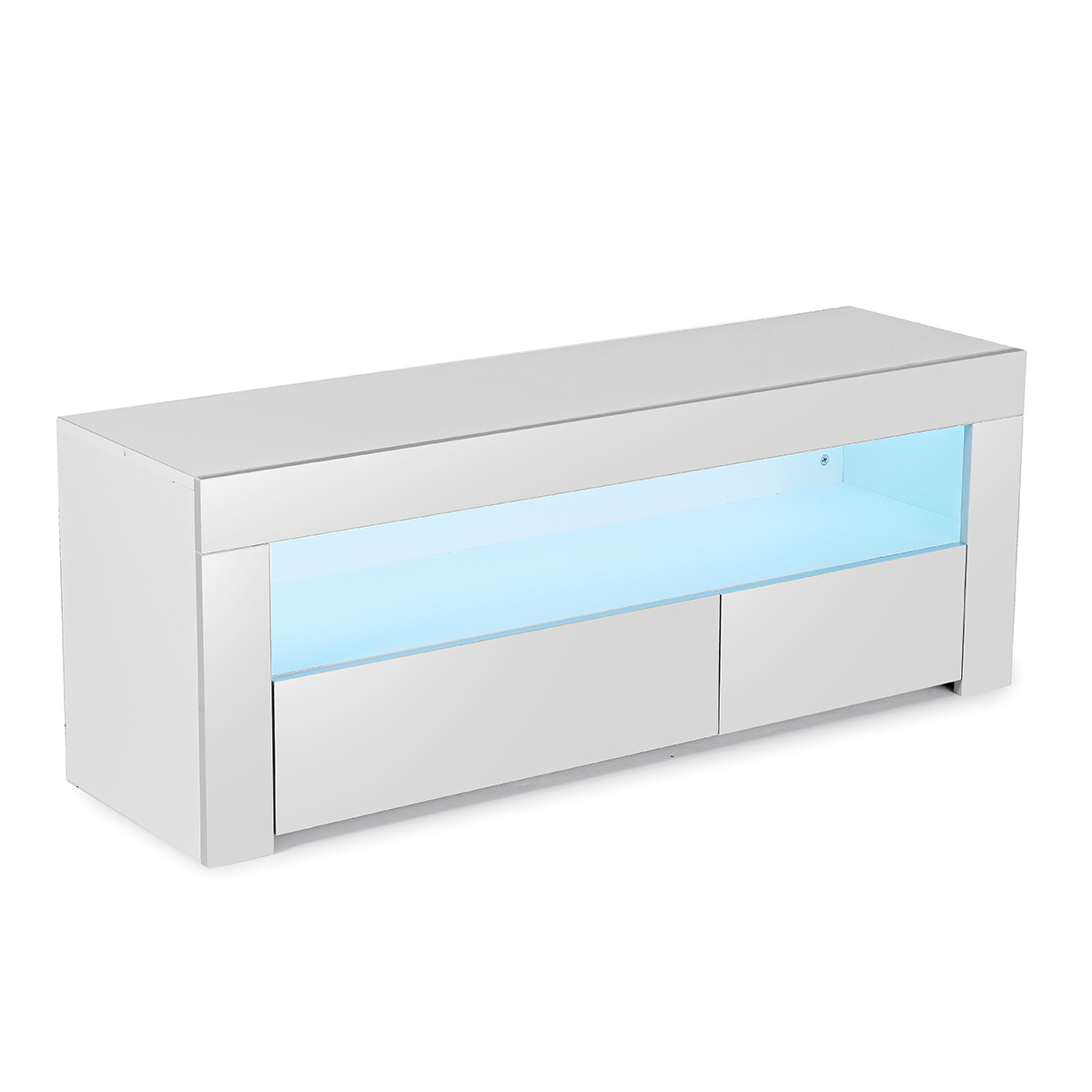 The Television stand is made of high-grade MDF construction with durable laminate, High gloss Eco-friendly UV painted finish, With the smooth surface, easy to maintain and keep clean.
